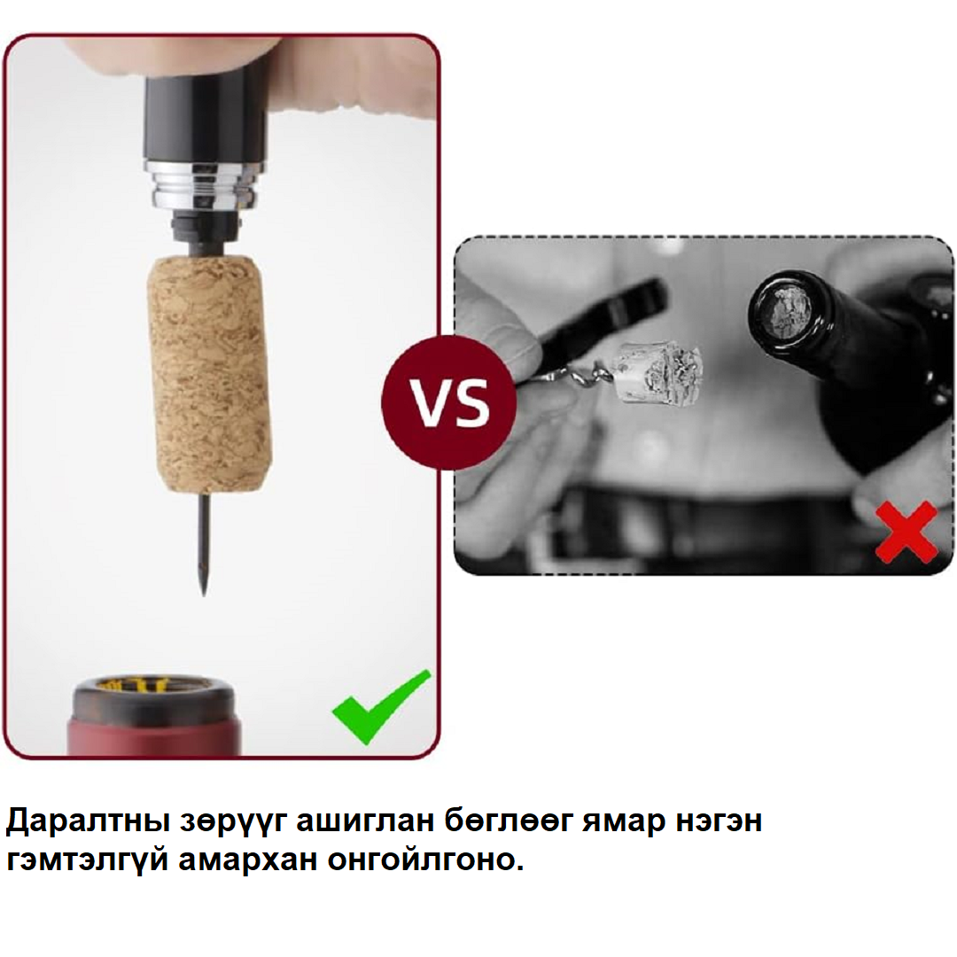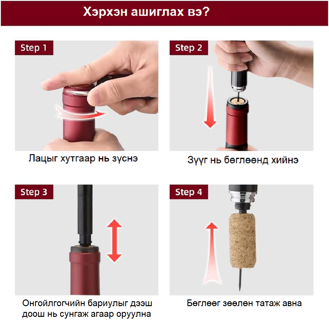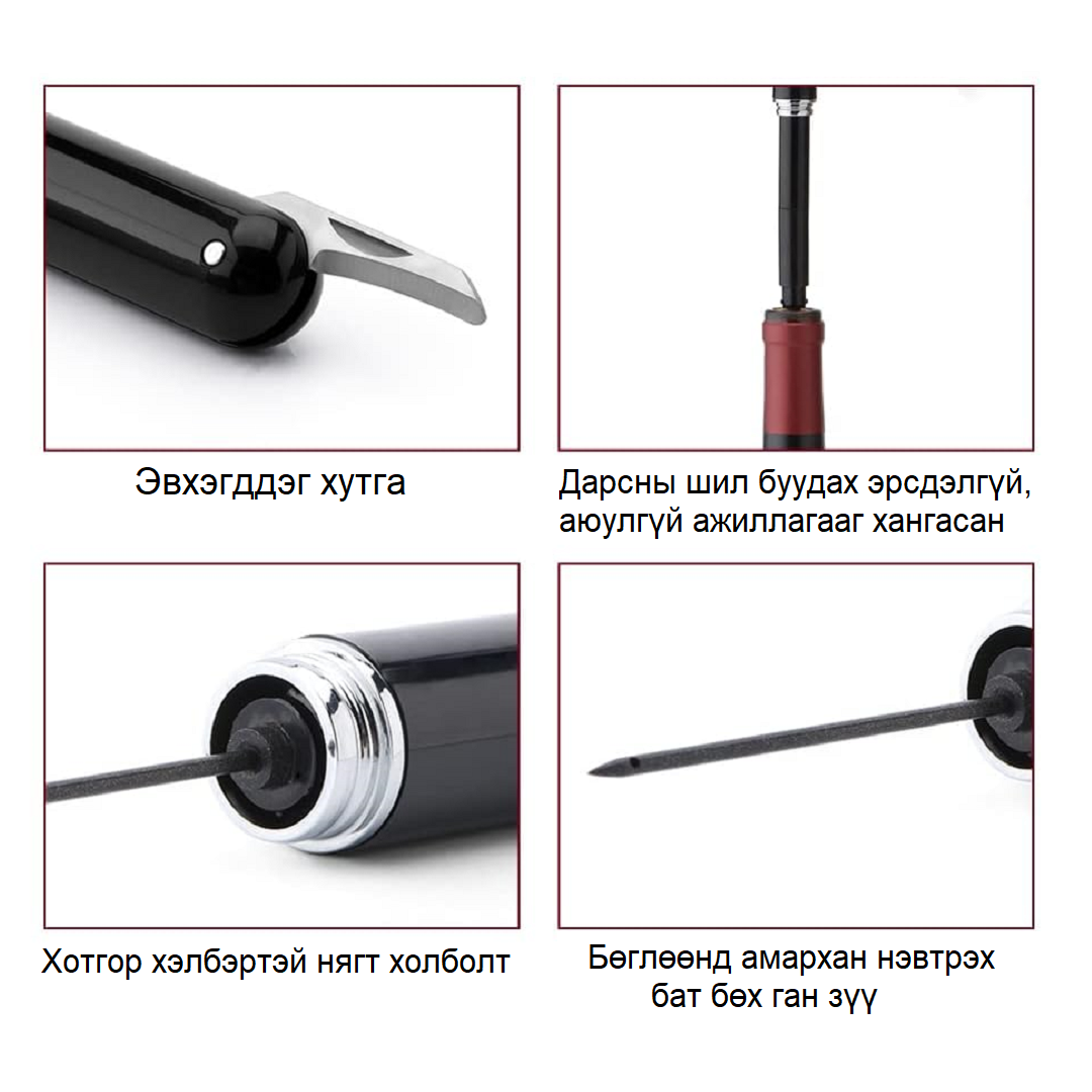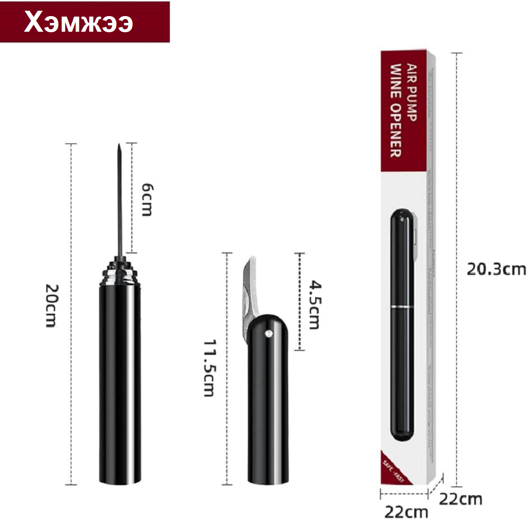 Үзгэн хэлбэртэй, лацыг зүсэх эвхэгддэг хутгатай, 2 функц бүхий авсаархан зөөврийн хийн даралтаар дарс онгойлгогч